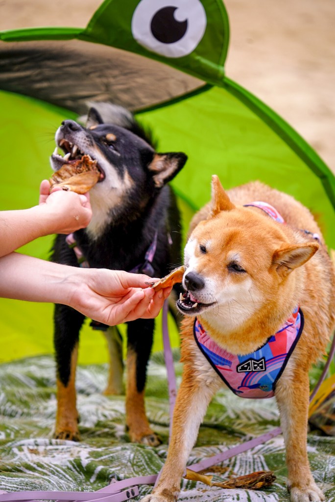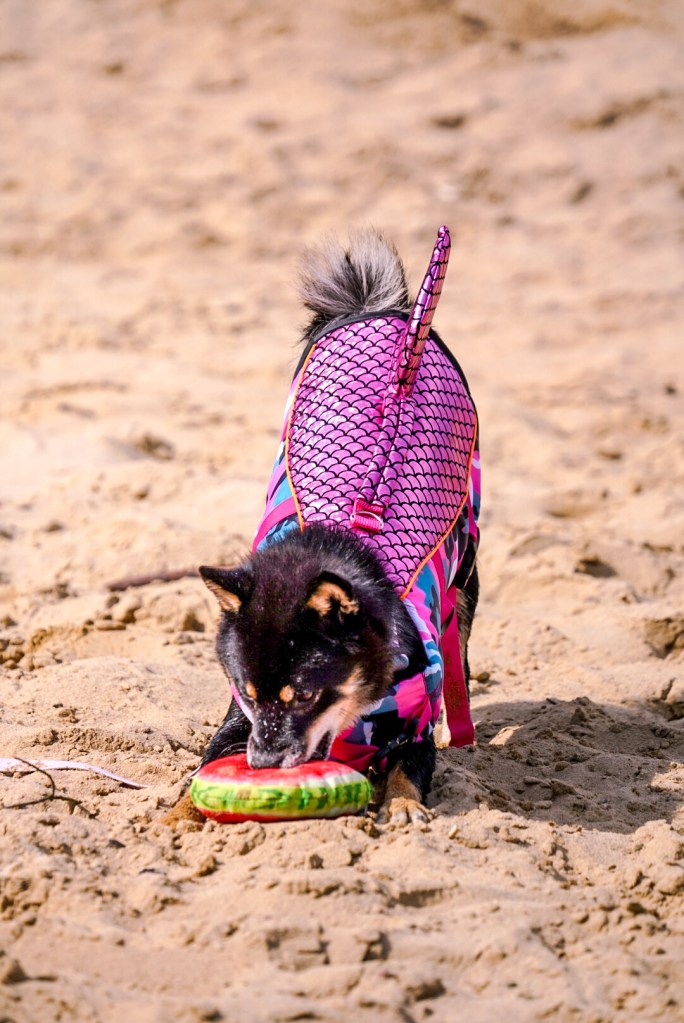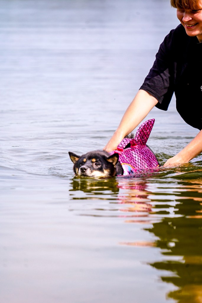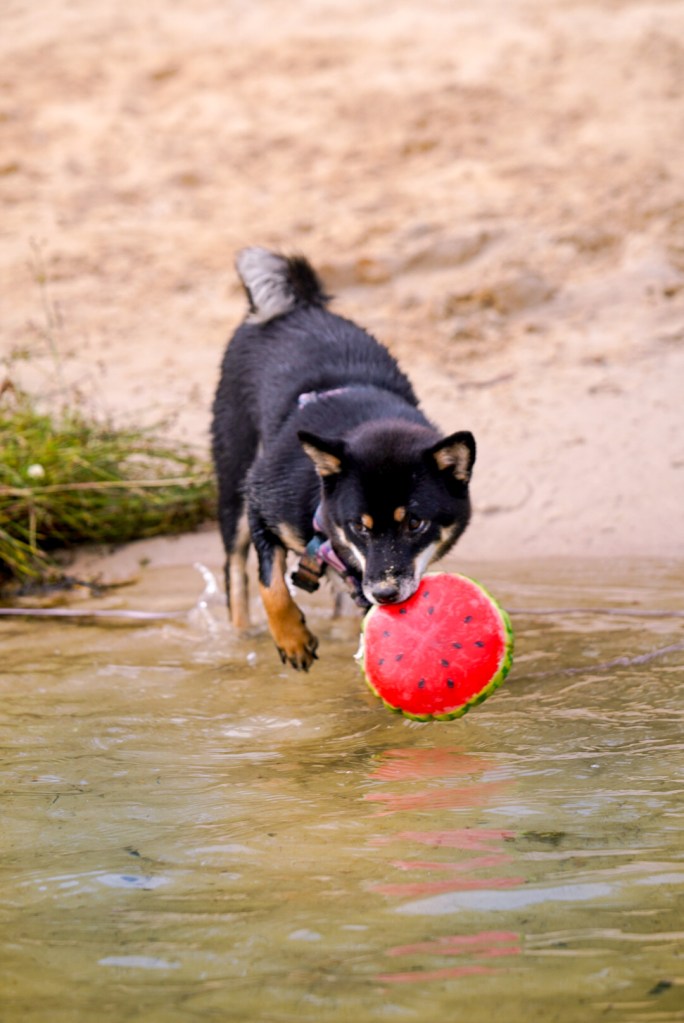 Zanim wejdziemy do wody, robimy rozgrzewkę mięśni na lądzie. Bawimy się szarpakiem lub ulubioną / nową zabawką, którą później będziecie mogli zamoczyć (najlepiej taka, która unosi się na wodzie). Dla naszych shib najlepszą zachętą było wejście z nimi do wody. Dało im to 90% do odwagi! 100% było, gdy weszły razem we dwie! Pomogło też, że Celina była już wcześniej zapoznawana z wodą, więc nie bała się i wiedziała co robić. Bardzo pomogło to Sabrinie! Przez obserwację siostry, zyskałyśmy jakby cały 1 dzień nauki! Jeśli macie więc „doświadczonego” pływaka wśród znajomych, może warto wybrać się na wspólny wypad.