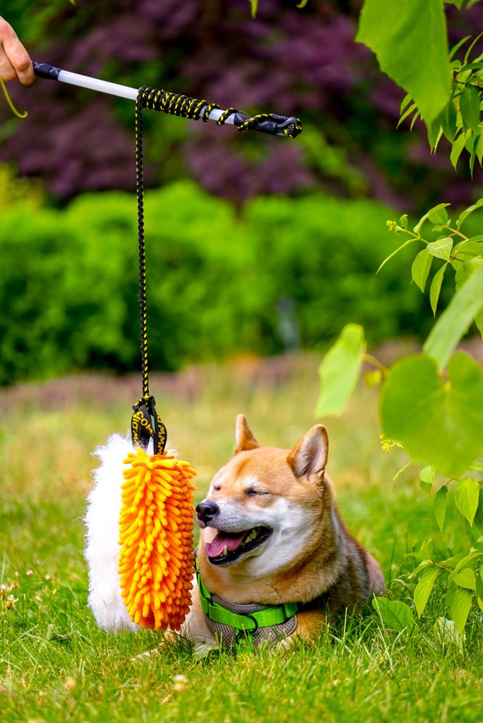 Do tej pory kupowałyśmy takie zabawki na wędce dla kotów, ale nie były dla nas wystarczająco solidne i bezpieczne. Pies jest jednak trochę większy i silniejszy 🤪 Zabawki szybko ulegały zniszczeniu. Dodatkowo bałyśmy się ryzyka połknięcia drobnych elementów w zabawie i tego, że elastyczna gumka uderzy w oko i zrani psa.