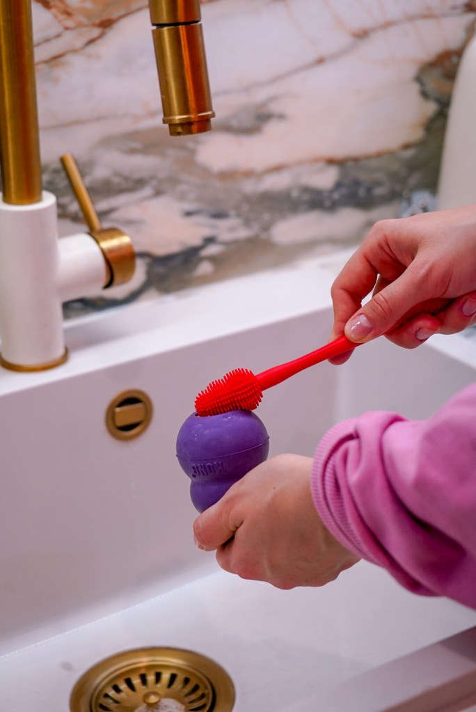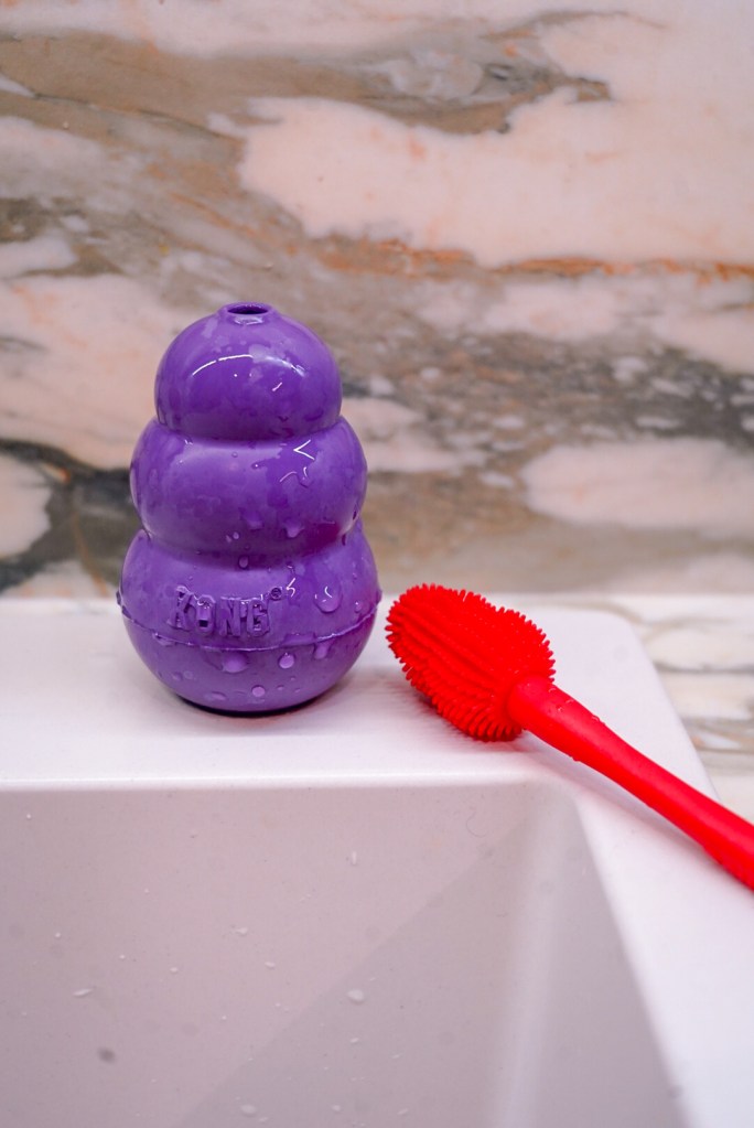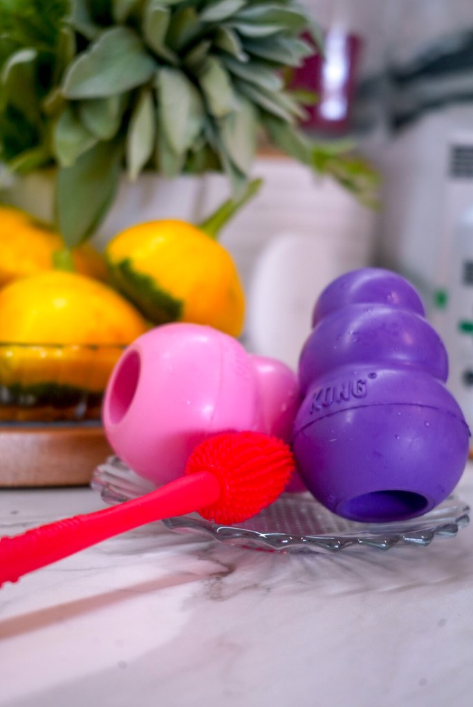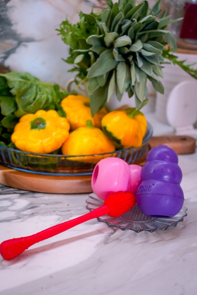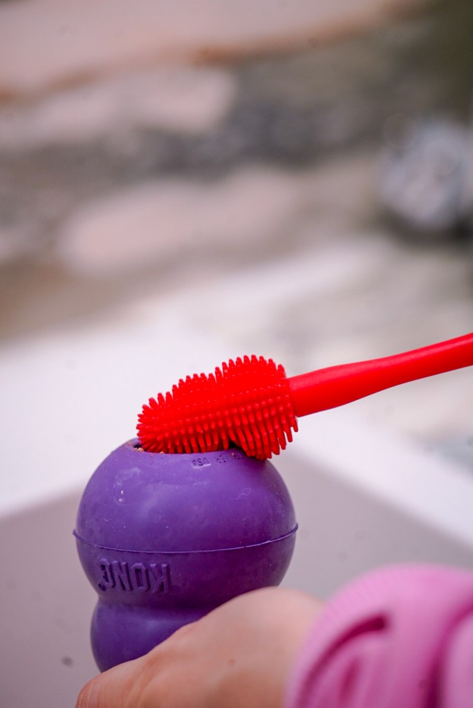 Brina złapała zabawkę przypominającą ring. Ta jest super do aportów, ale też do memłania. Ma wypustki masujące dziąsła i miejsce na przysmaki / masełko. Jest bardzo solidna i dosyć spora, więc super sprawdzi się dla średnich i większych piesków.
